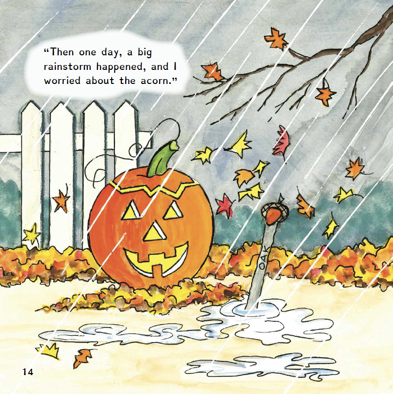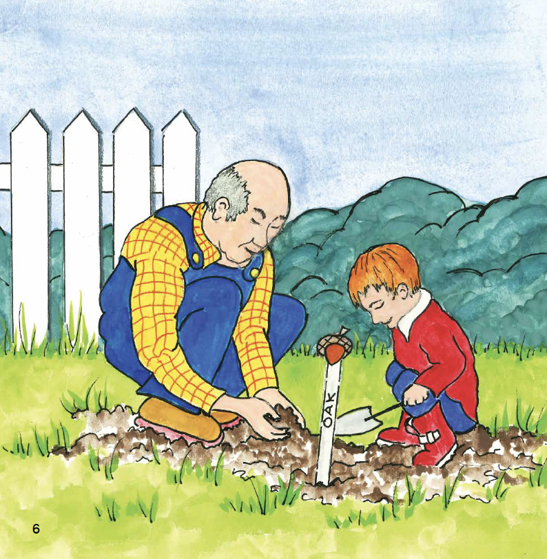 Charlie looks at the big oak tree outside his grandparent’s kitchen window, and asks his Grandpa Jack, how did the oak tree grow so big? Grandpa Jacks tells Charlie a story from his own childhood, when he found a little acorn and with the help of his own grandfather, planted it in the garden. Young Jack waited patiently for the acorn to grow and visited his grandparents every weekend to check the trees progress. Over many weeks and months, there was still no sign of a tree, and Jack feared the little acorn had been washed away in the rainstorms, or frozen in the winter snow. Until one spring day, a little sapling sprouted from the ground. Jack took very good care of the little tree, watering it, talking to it, and protecting it from the frost in winter. Over several years, the little sapling grew into a magnificent tree, and became home to many creatures, including cardinals, owls and hawks. The tree was enjoyed by the whole family for many years, as the house and beloved tree were passed through the generations. Grandpa Jack asks Charlie to take good care of the tree and he ties an old rope and tire to the branches, so Charlie can play and enjoy the splendid specimen.